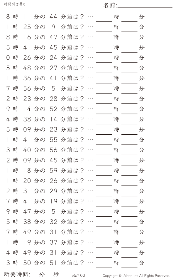 上記のボタンから「時間引き算6:1分単位」の算数数学ドリル・計算ドリル(PDFプリント)がダウンロードできます。個人利用は無料です(家庭以外での配布は有料です)。