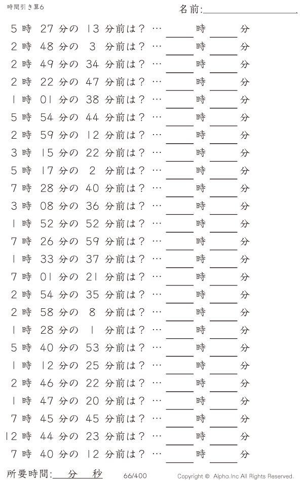 上記のボタンから「時間引き算6:1分単位」の算数数学ドリル・計算ドリル(PDFプリント)がダウンロードできます。個人利用は無料です(家庭以外での配布は有料です)。