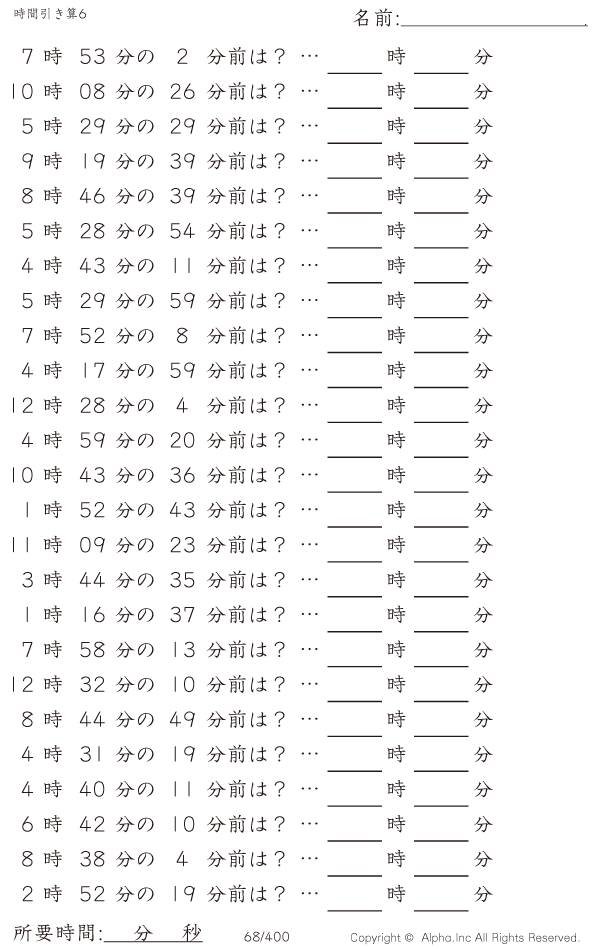 上記のボタンから「時間引き算6:1分単位」の算数数学ドリル・計算ドリル(PDFプリント)がダウンロードできます。個人利用は無料です(家庭以外での配布は有料です)。
