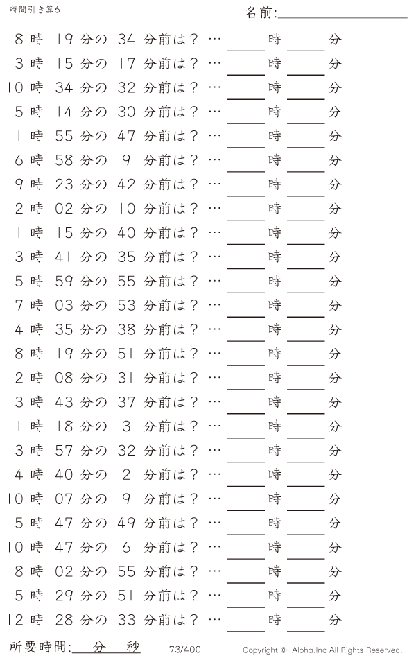 上記のボタンから「時間引き算6:1分単位」の算数数学ドリル・計算ドリル(PDFプリント)がダウンロードできます。個人利用は無料です(家庭以外での配布は有料です)。