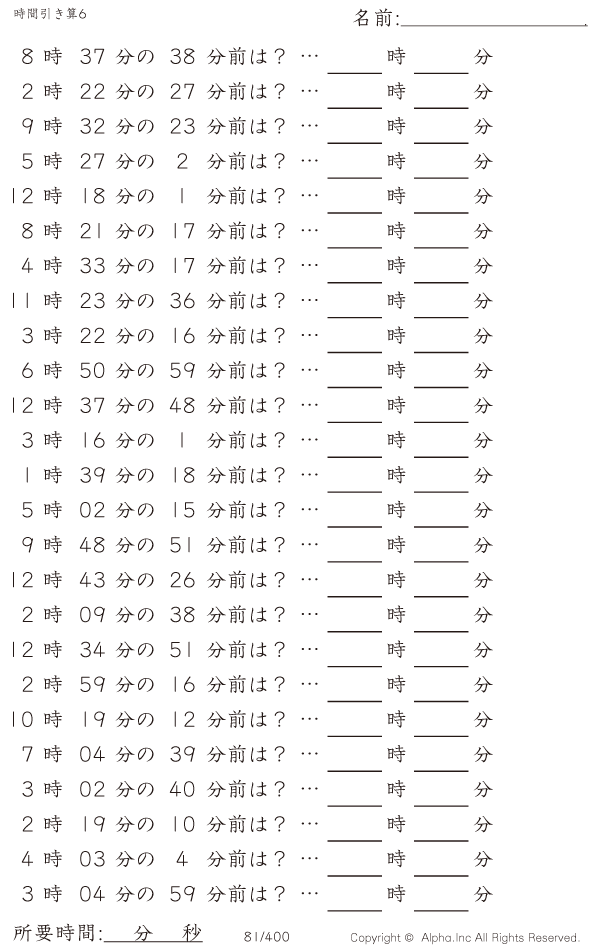 上記のボタンから「時間引き算6:1分単位」の算数数学ドリル・計算ドリル(PDFプリント)がダウンロードできます。個人利用は無料です(家庭以外での配布は有料です)。