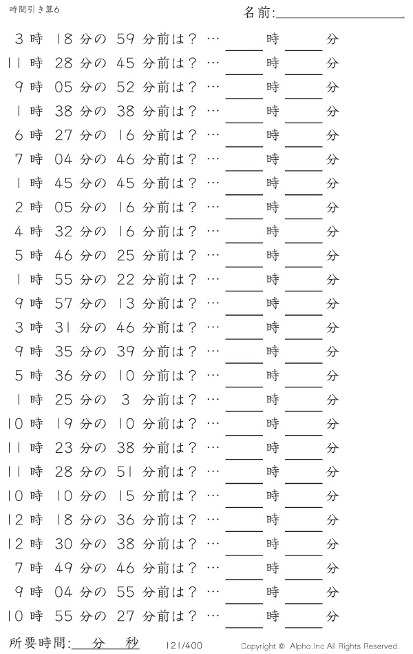 時間引き算6:1分単位 [問題]121/400