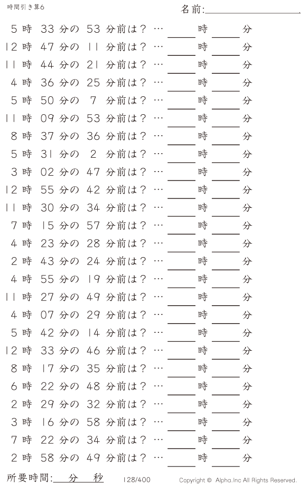 時間引き算6:1分単位 [問題]128/400