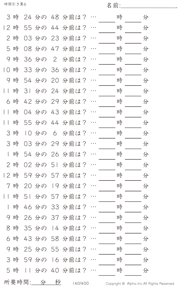 上記のボタンから「時間引き算6:1分単位」の算数数学ドリル・計算ドリル(PDFプリント)がダウンロードできます。個人利用は無料です(家庭以外での配布は有料です)。