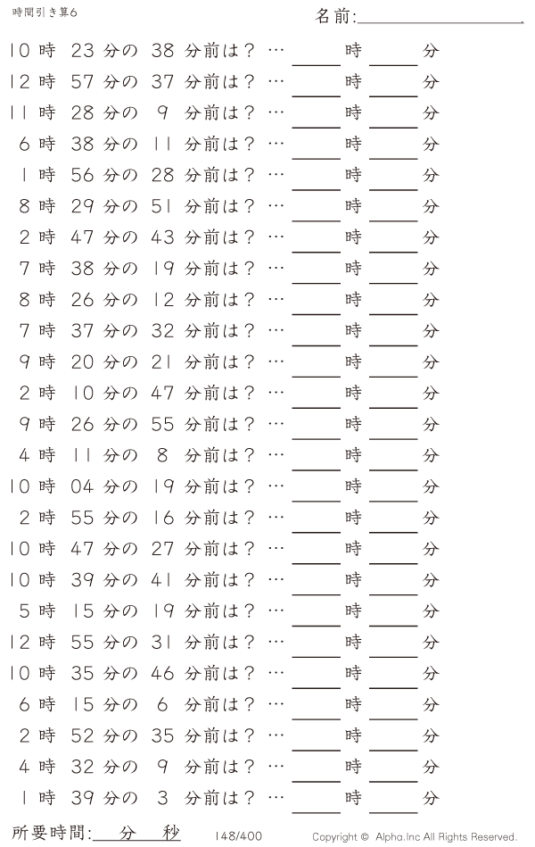 上記のボタンから「時間引き算6:1分単位」の算数数学ドリル・計算ドリル(PDFプリント)がダウンロードできます。個人利用は無料です(家庭以外での配布は有料です)。