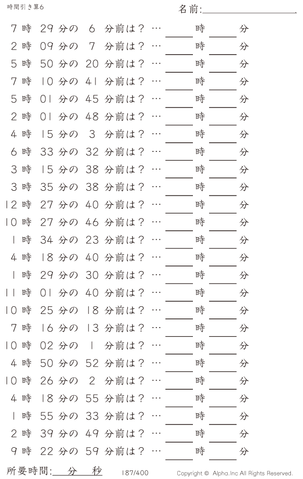 上記のボタンから「時間引き算6:1分単位」の算数数学ドリル・計算ドリル(PDFプリント)がダウンロードできます。個人利用は無料です(家庭以外での配布は有料です)。