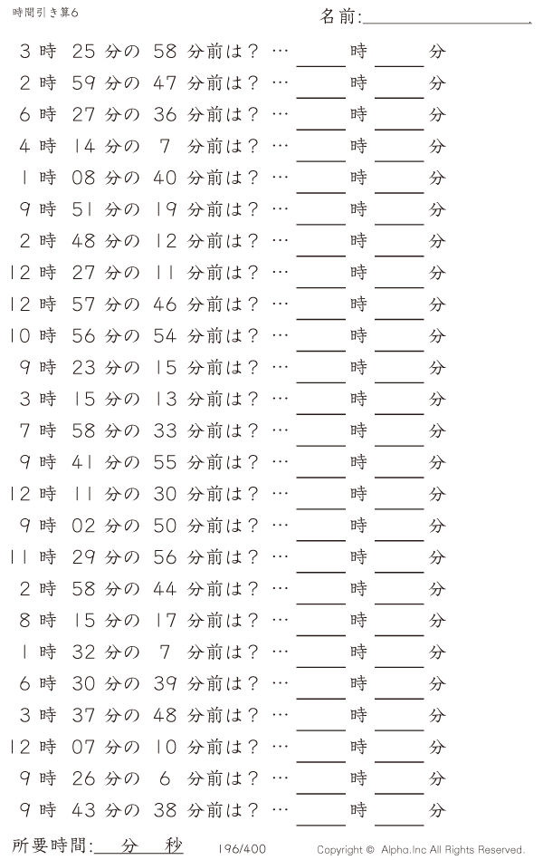 時間引き算6:1分単位 [問題]196/400
