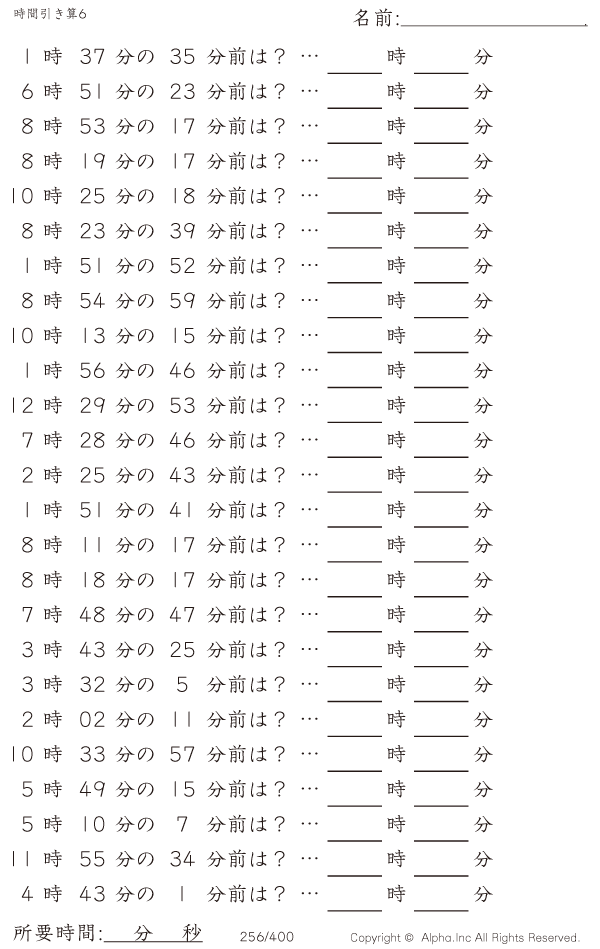 上記のボタンから「時間引き算6:1分単位」の算数数学ドリル・計算ドリル(PDFプリント)がダウンロードできます。個人利用は無料です(家庭以外での配布は有料です)。
