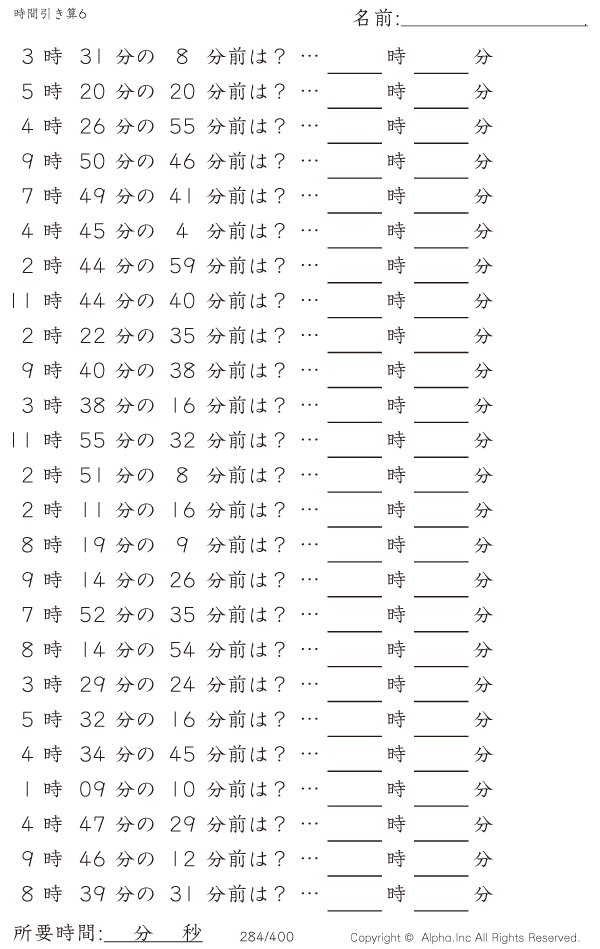 上記のボタンから「時間引き算6:1分単位」の算数数学ドリル・計算ドリル(PDFプリント)がダウンロードできます。個人利用は無料です(家庭以外での配布は有料です)。