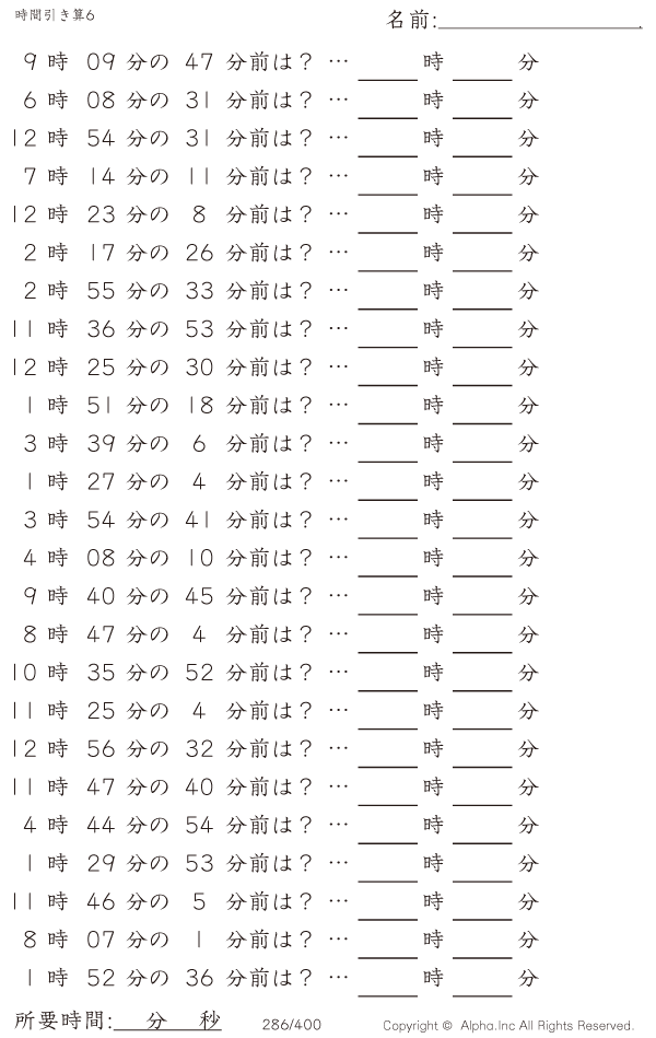 時間引き算6:1分単位 [問題]286/400