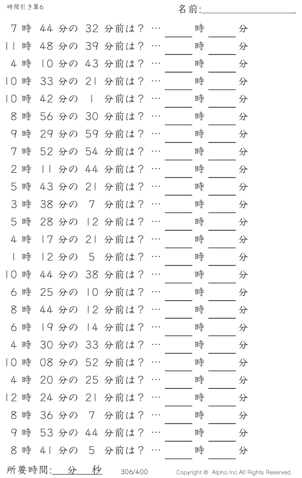 時間引き算6:1分単位 [問題]306/400