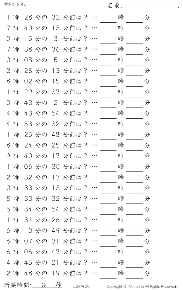 上記のボタンから「時間引き算6:1分単位」の算数数学ドリル・計算ドリル(PDFプリント)がダウンロードできます。個人利用は無料です(家庭以外での配布は有料です)。