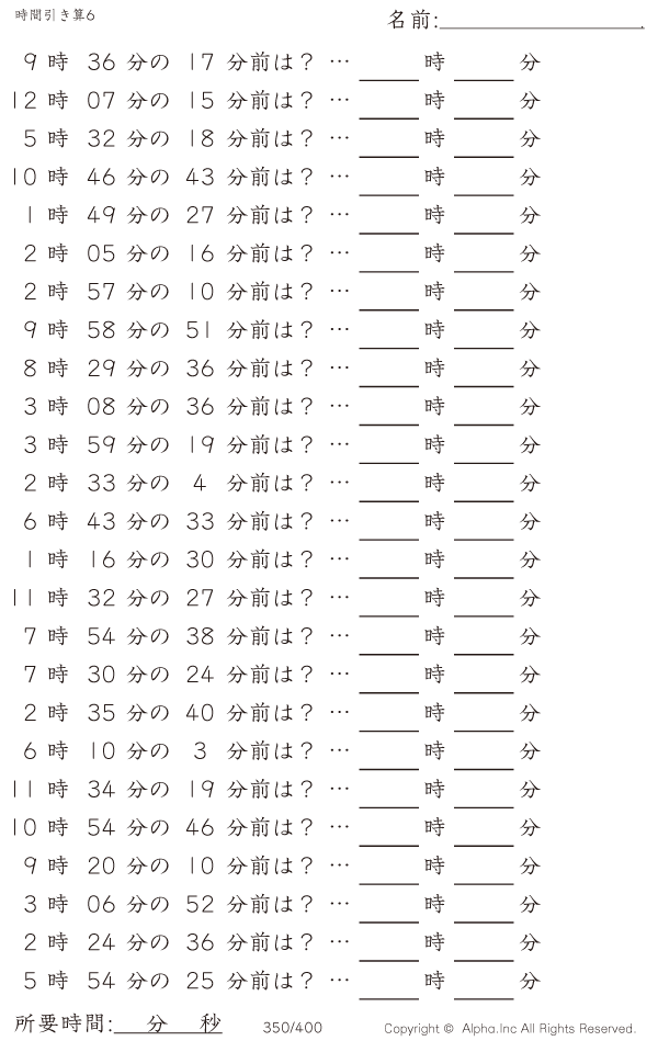上記のボタンから「時間引き算6:1分単位」の算数数学ドリル・計算ドリル(PDFプリント)がダウンロードできます。個人利用は無料です(家庭以外での配布は有料です)。