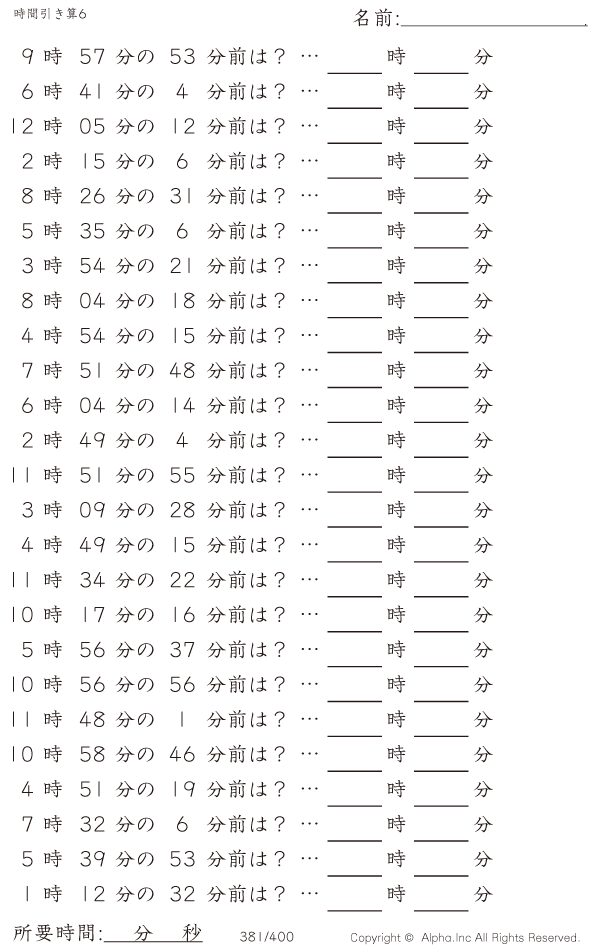 上記のボタンから「時間引き算6:1分単位」の算数数学ドリル・計算ドリル(PDFプリント)がダウンロードできます。個人利用は無料です(家庭以外での配布は有料です)。