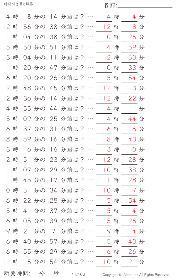 上記のボタンから「時間引き算6:1分単位」の算数数学ドリル・計算ドリル(PDFプリント)がダウンロードできます。個人利用は無料です(家庭以外での配布は有料です)。