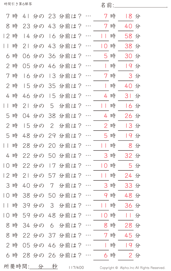 上記のボタンから「時間引き算6:1分単位」の算数数学ドリル・計算ドリル(PDFプリント)がダウンロードできます。個人利用は無料です(家庭以外での配布は有料です)。