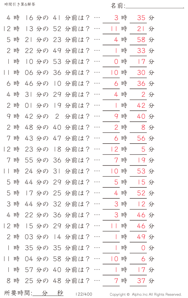 上記のボタンから「時間引き算6:1分単位」の算数数学ドリル・計算ドリル(PDFプリント)がダウンロードできます。個人利用は無料です(家庭以外での配布は有料です)。