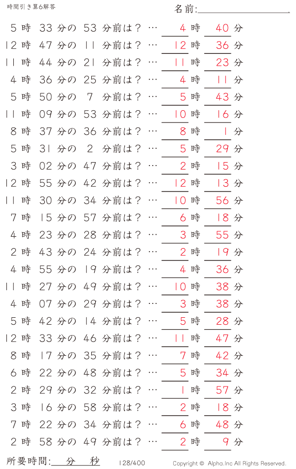 時間引き算6:1分単位 [解答]128/400