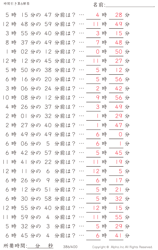 上記のボタンから「時間引き算6:1分単位」の算数数学ドリル・計算ドリル(PDFプリント)がダウンロードできます。個人利用は無料です(家庭以外での配布は有料です)。