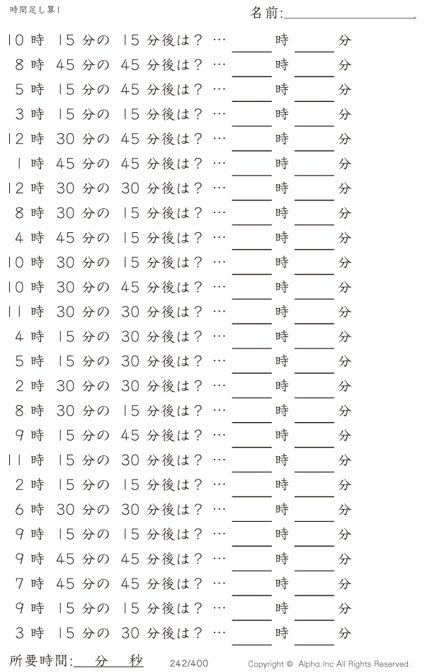 上記のボタンから「時間足し算1:15分単位」の算数数学ドリル・計算ドリル(PDFプリント)がダウンロードできます。個人利用は無料です(家庭以外での配布は有料です)。