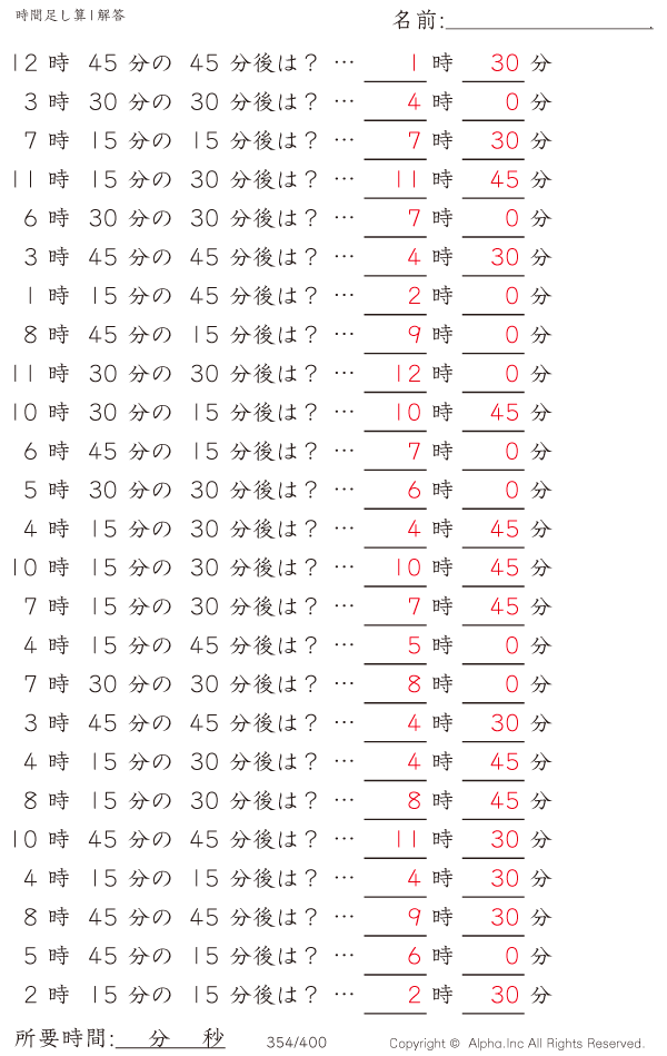 上記のボタンから「時間足し算1:15分単位」の算数数学ドリル・計算ドリル(PDFプリント)がダウンロードできます。個人利用は無料です(家庭以外での配布は有料です)。