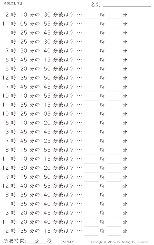 上記のボタンから「時間足し算2:5分単位」の算数数学ドリル・計算ドリル(PDFプリント)がダウンロードできます。個人利用は無料です(家庭以外での配布は有料です)。