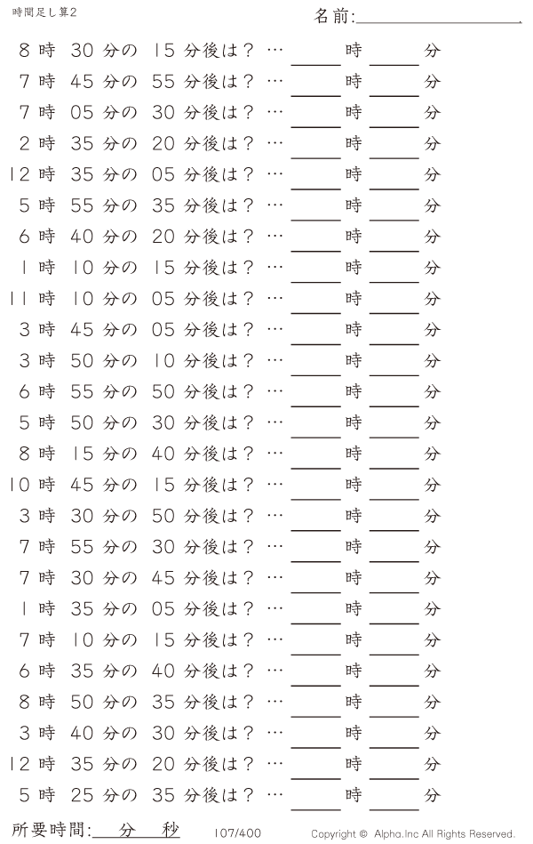 上記のボタンから「時間足し算2:5分単位」の算数数学ドリル・計算ドリル(PDFプリント)がダウンロードできます。個人利用は無料です(家庭以外での配布は有料です)。