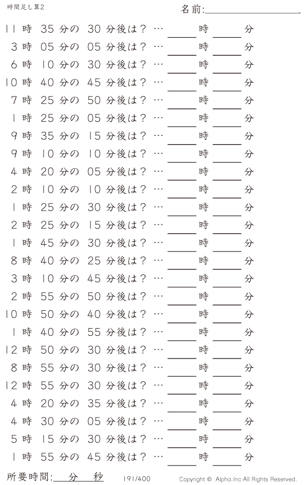上記のボタンから「時間足し算2:5分単位」の算数数学ドリル・計算ドリル(PDFプリント)がダウンロードできます。個人利用は無料です(家庭以外での配布は有料です)。