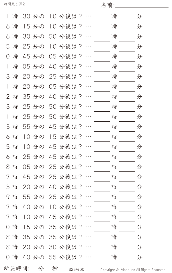 上記のボタンから「時間足し算2:5分単位」の算数数学ドリル・計算ドリル(PDFプリント)がダウンロードできます。個人利用は無料です(家庭以外での配布は有料です)。