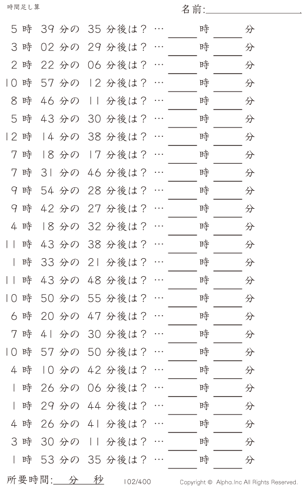 上記のボタンから「時間足し算3:1分単位」の算数数学ドリル・計算ドリル(PDFプリント)がダウンロードできます。個人利用は無料です(家庭以外での配布は有料です)。