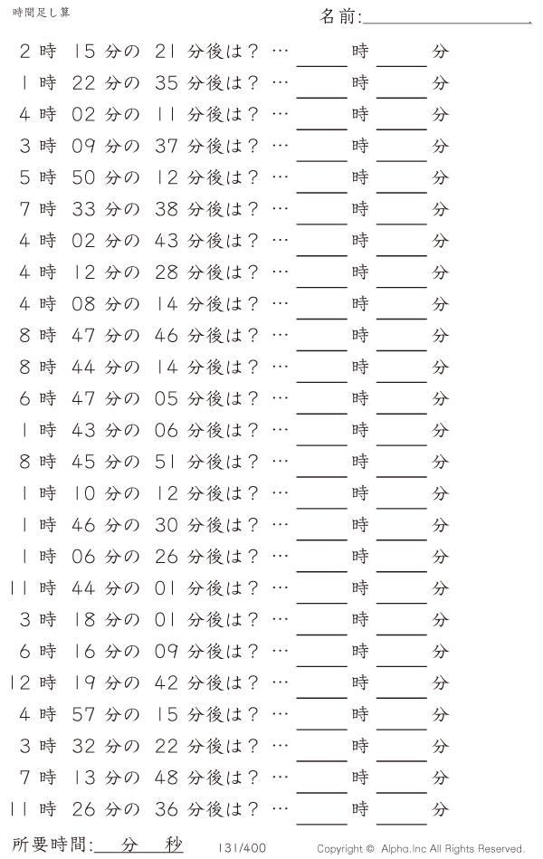 上記のボタンから「時間足し算3:1分単位」の算数数学ドリル・計算ドリル(PDFプリント)がダウンロードできます。個人利用は無料です(家庭以外での配布は有料です)。