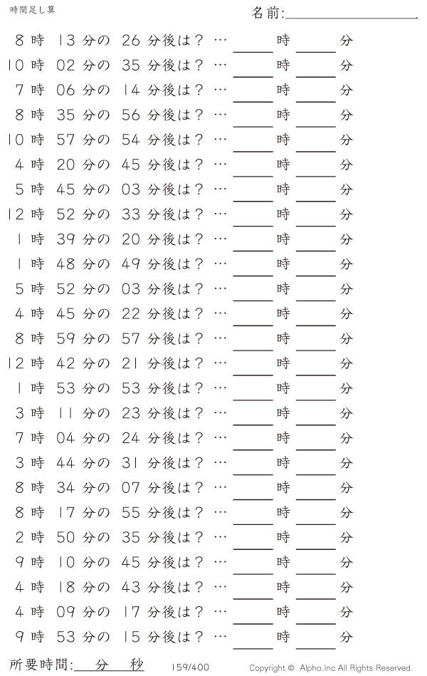 上記のボタンから「時間足し算3:1分単位」の算数数学ドリル・計算ドリル(PDFプリント)がダウンロードできます。個人利用は無料です(家庭以外での配布は有料です)。