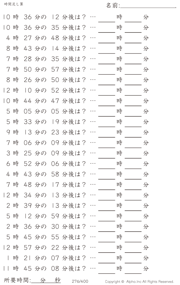 上記のボタンから「時間足し算3:1分単位」の算数数学ドリル・計算ドリル(PDFプリント)がダウンロードできます。個人利用は無料です(家庭以外での配布は有料です)。