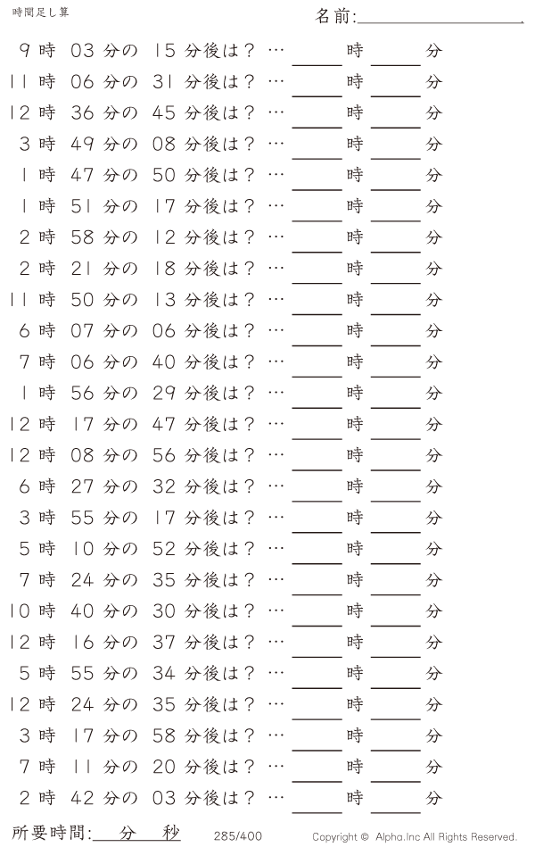 上記のボタンから「時間足し算3:1分単位」の算数数学ドリル・計算ドリル(PDFプリント)がダウンロードできます。個人利用は無料です(家庭以外での配布は有料です)。