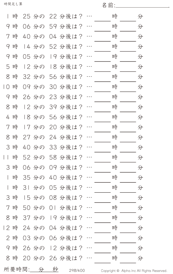 上記のボタンから「時間足し算3:1分単位」の算数数学ドリル・計算ドリル(PDFプリント)がダウンロードできます。個人利用は無料です(家庭以外での配布は有料です)。