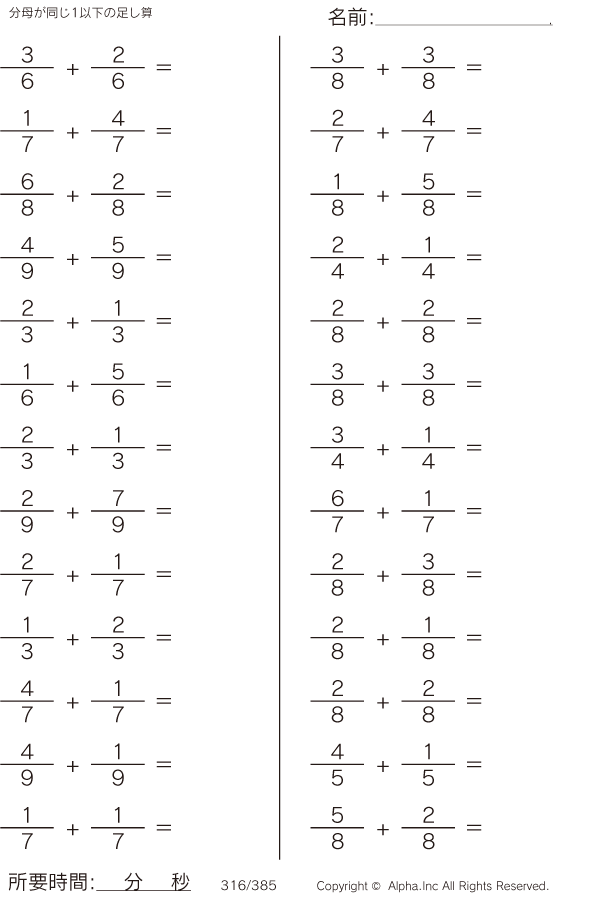 分数・分母が同じ1以下の足し算 [問題]316/385