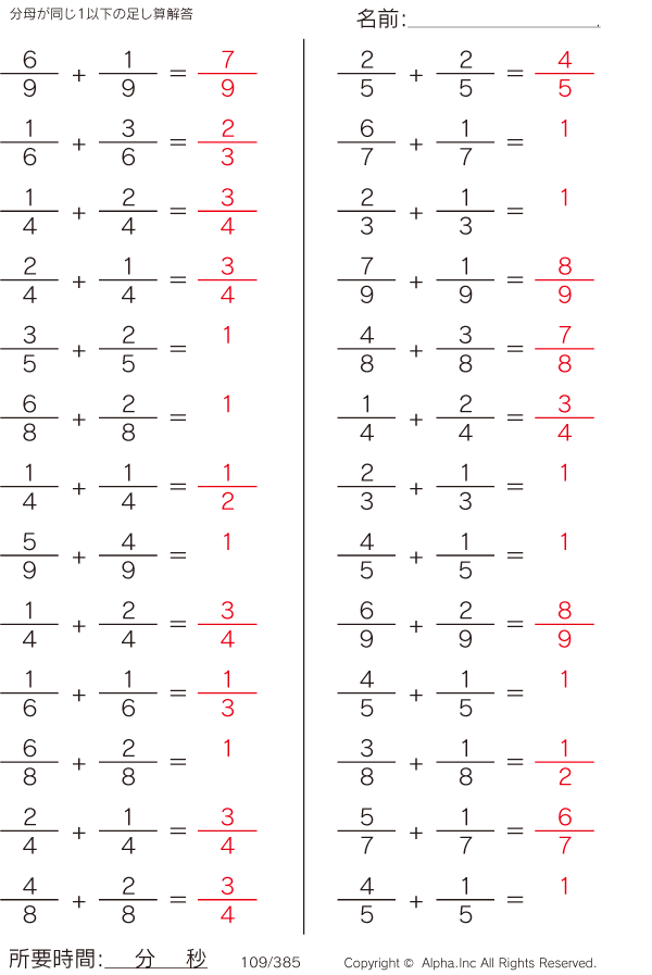 分数・分母が同じ1以下の足し算 [解答]109/385