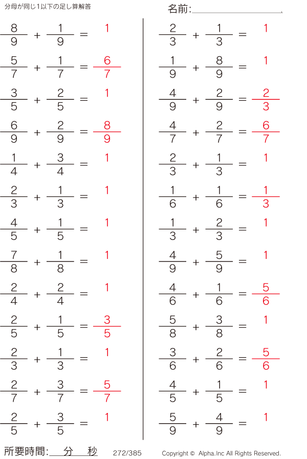 分数・分母が同じ1以下の足し算 [解答]272/385