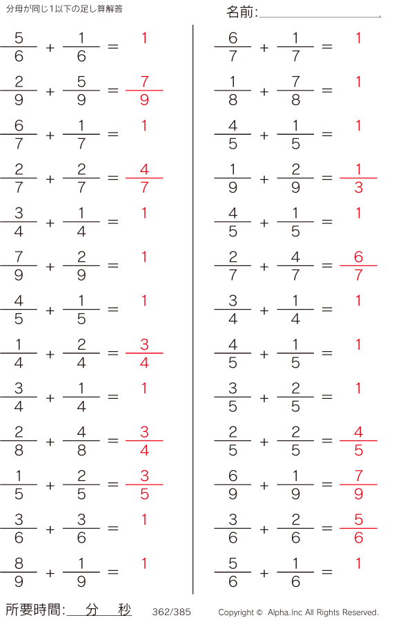 分数・分母が同じ1以下の足し算 [解答]362/385