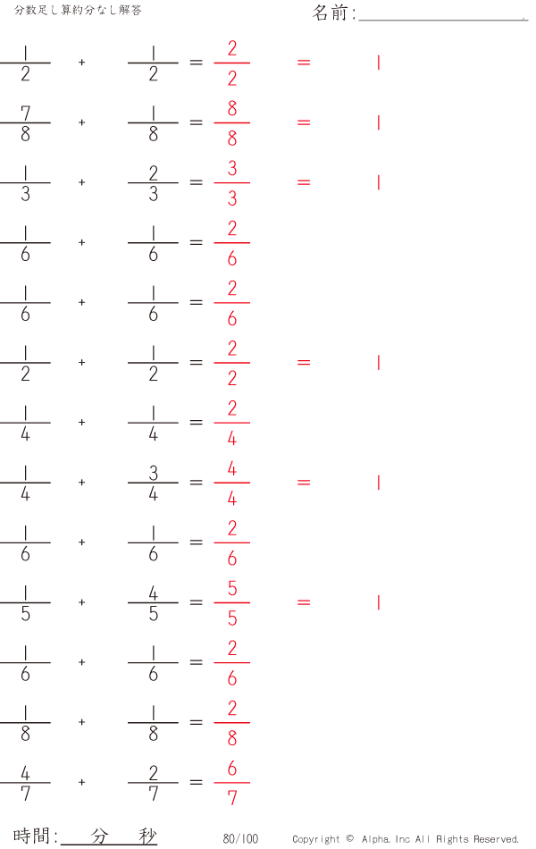 上記のボタンから「分数足し算約分なし」の算数数学ドリル・計算ドリル(PDFプリント)がダウンロードできます。個人利用は無料です(家庭以外での配布は有料です)。