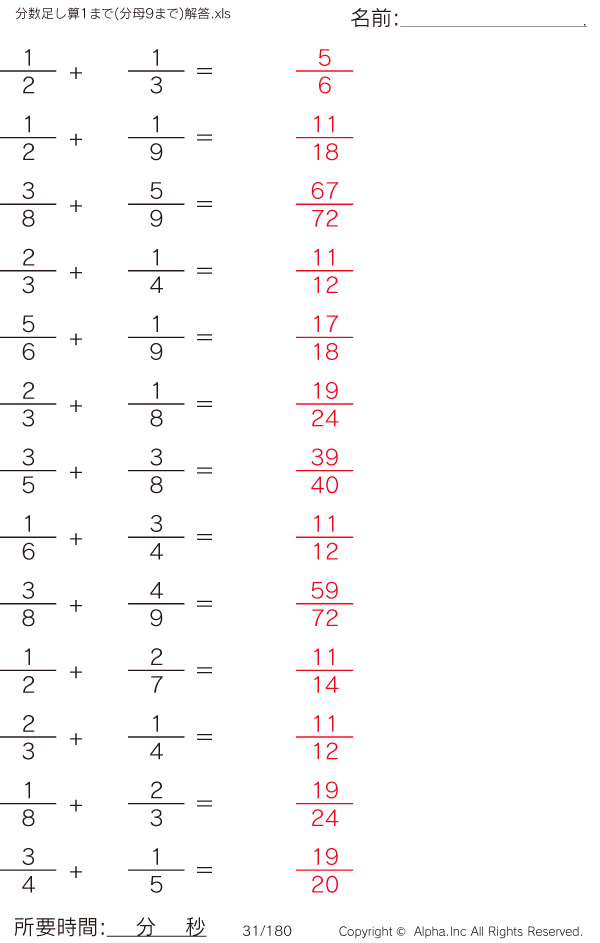 分数の足し算・解1まで(分母9まで) [解答]031/180
