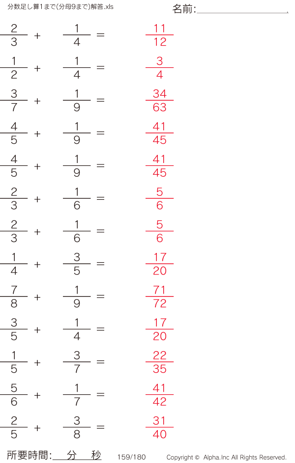 分数の足し算・解1まで(分母9まで) [解答]159/180