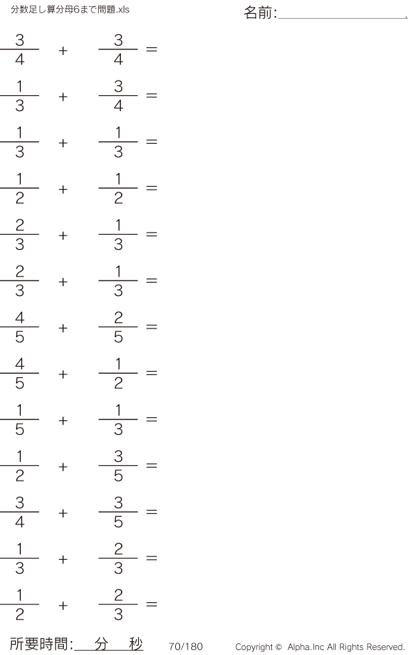 上記のボタンから「分数の足し算(分母6まで)」の算数数学ドリル・計算ドリル(PDFプリント)がダウンロードできます。個人利用は無料です(家庭以外での配布は有料です)。