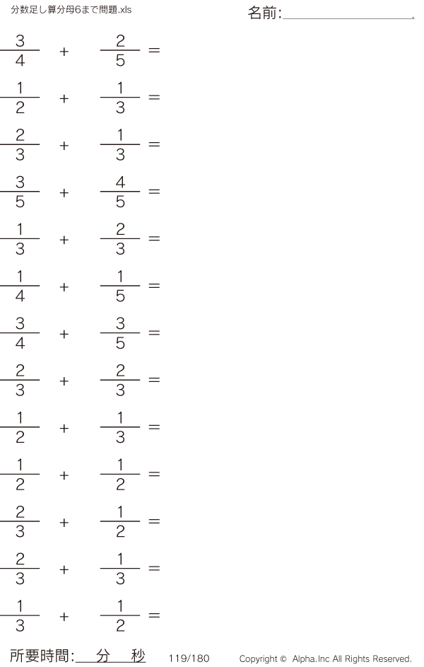 上記のボタンから「分数の足し算(分母6まで)」の算数数学ドリル・計算ドリル(PDFプリント)がダウンロードできます。個人利用は無料です(家庭以外での配布は有料です)。