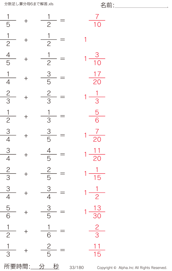 上記のボタンから「分数の足し算(分母6まで)」の算数数学ドリル・計算ドリル(PDFプリント)がダウンロードできます。個人利用は無料です(家庭以外での配布は有料です)。