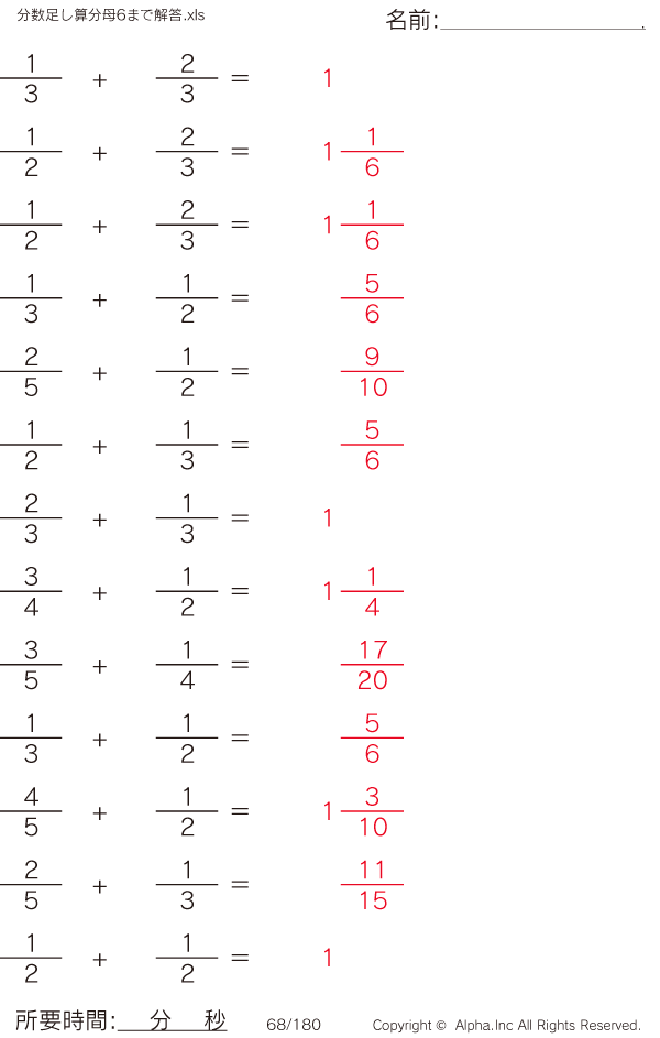 上記のボタンから「分数の足し算(分母6まで)」の算数数学ドリル・計算ドリル(PDFプリント)がダウンロードできます。個人利用は無料です(家庭以外での配布は有料です)。