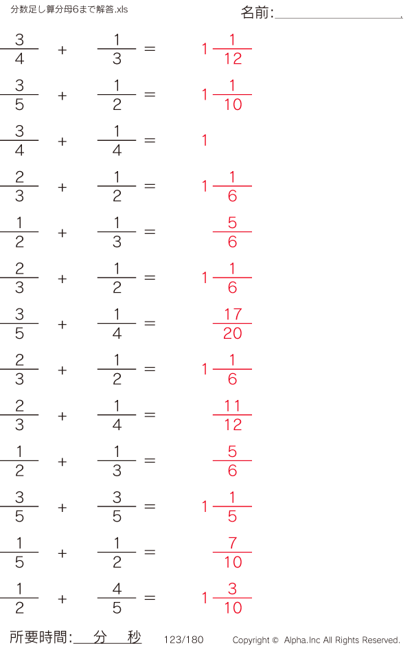 上記のボタンから「分数の足し算(分母6まで)」の算数数学ドリル・計算ドリル(PDFプリント)がダウンロードできます。個人利用は無料です(家庭以外での配布は有料です)。