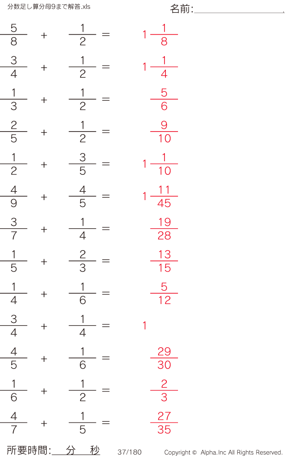 上記のボタンから「分数の足し算(分母9まで)」の算数数学ドリル・計算ドリル(PDFプリント)がダウンロードできます。個人利用は無料です(家庭以外での配布は有料です)。