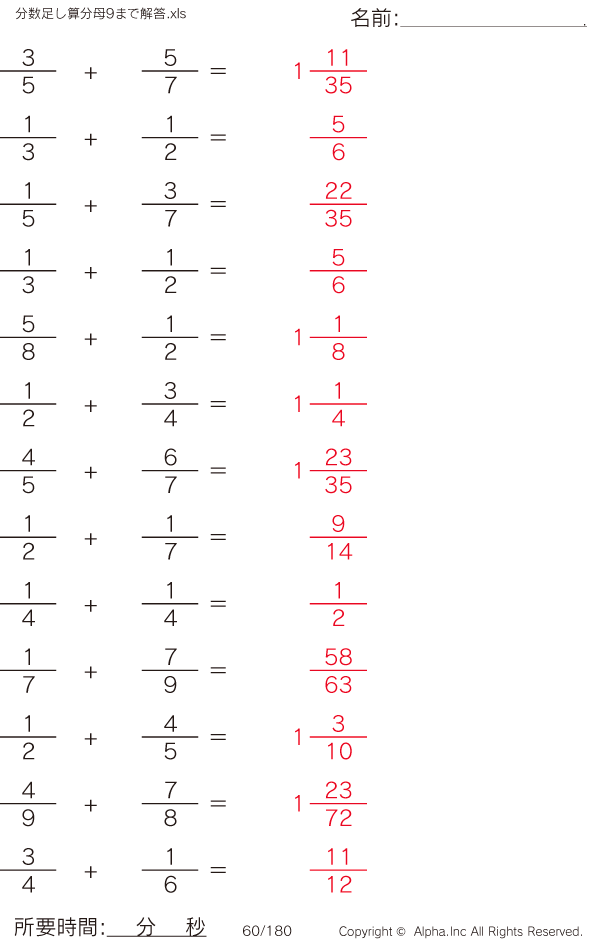 分数の足し算(分母9まで) [解答]060/180