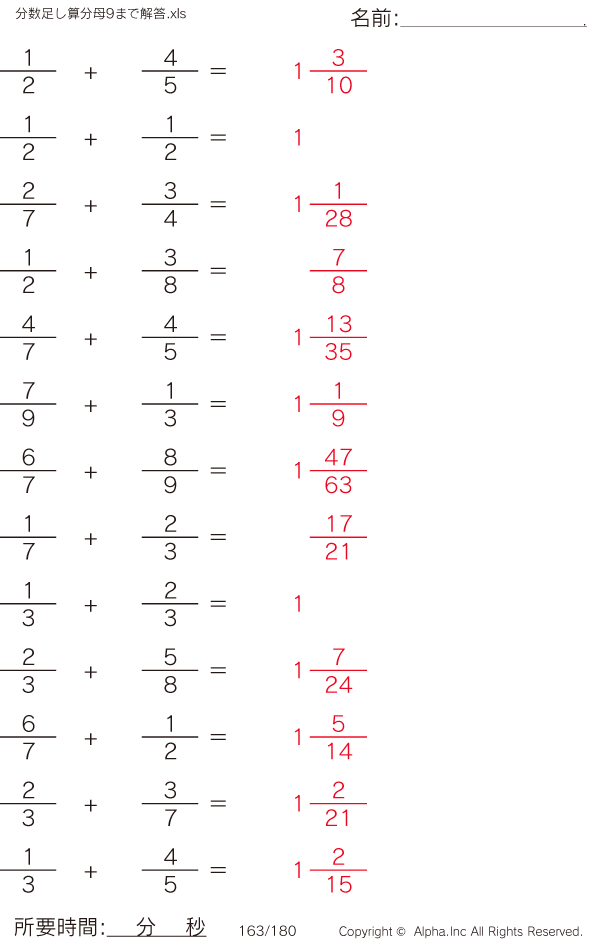 上記のボタンから「分数の足し算(分母9まで)」の算数数学ドリル・計算ドリル(PDFプリント)がダウンロードできます。個人利用は無料です(家庭以外での配布は有料です)。